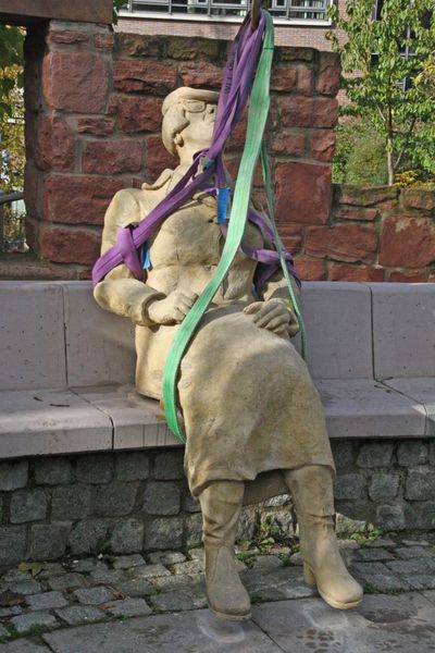 Fünf Monate saßen die sieben steinernen Figuren ohne ihre Punktfrau auf der Bank am Seeheimer Halbkreis hinter dem Rathaus - im Mai hatten Vandalen die Figur zerstört. Zum Glück konnte sie mit Erlaubnis des Künstlers Peter Lenk aus Bodman am Bodensee hier vor Ort repariert werden. Das ersparte erhebliche Kosten, die sich die Gemeinde Seeheim-Jugenheim und der Heimat- und Verschönerungsverein (HVV) teilen.