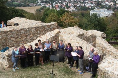 Zwei große Höhepunkte waren der Vortrag von Jochen Singer als Benediktiner-Mönch über das Kloster Lorsch und die Verbindung zu Seeheim, und die Renaissance-Lieder von Stimmwolf e.V. Peter Künzel informierte die interessierten Burgbesucher bei Rundgängen über das Burggelände.